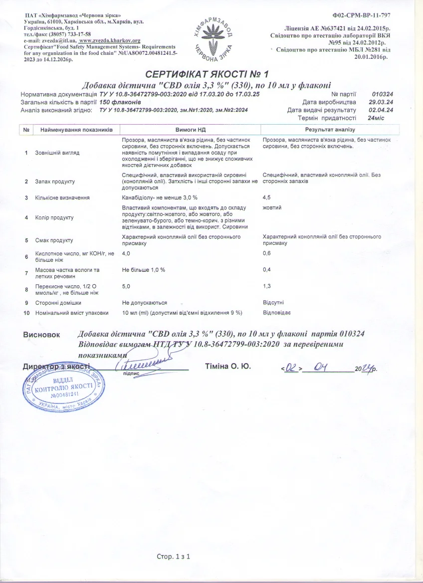 | Склад | МСТ-олія, CBD (КБД) 330 мг |