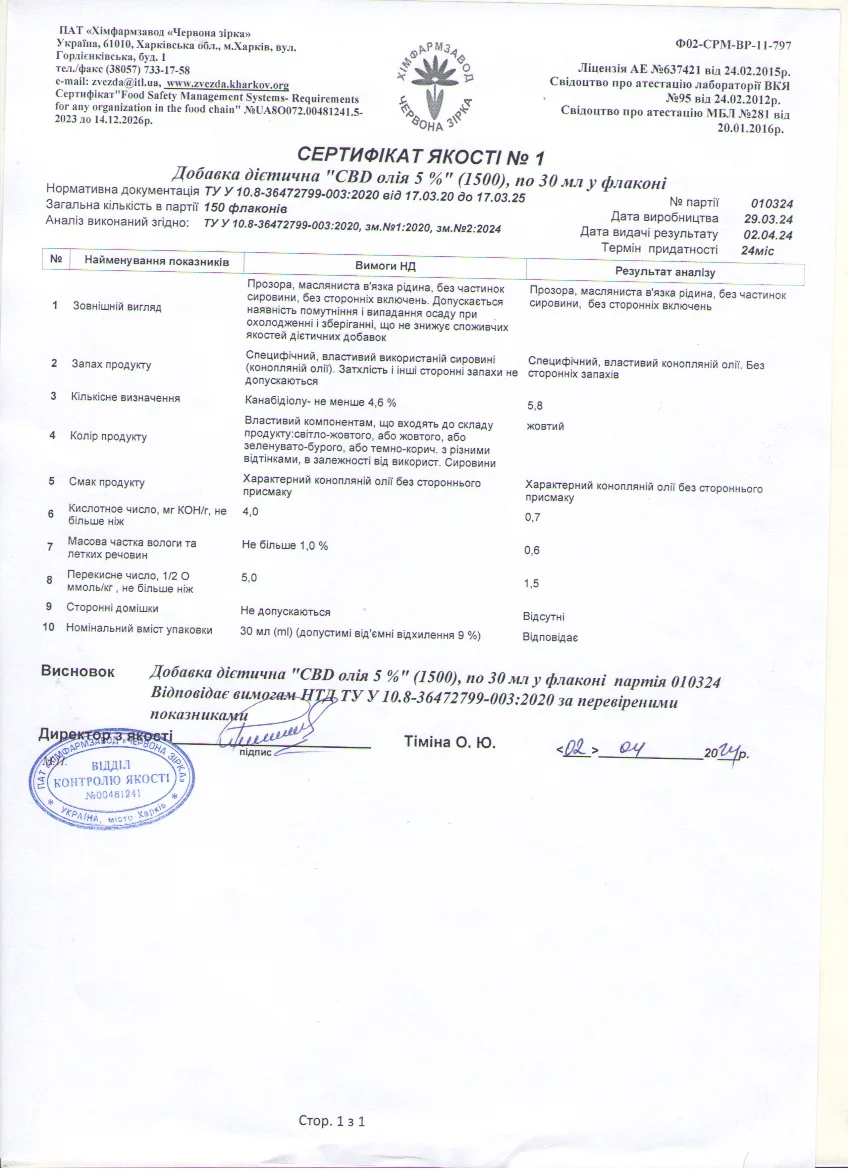 | Склад | МСТ-олія, CBD (КБД) 1500 мг |
